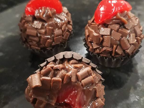 Um Brigadeiro cremoso, macio, feito com chocolate nobre e recheado com uma autêntica cereja Marrasquino em calda e coberto com chocolate nobre.