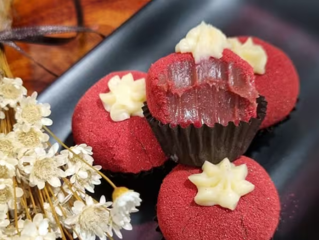 Um clássico da confeitaria transformado em brigadeiro, com uma cor vibrante e textura aveludada. Um brigadeiro de baunilha coberto com açúcar vermelho e Cream Cheese.